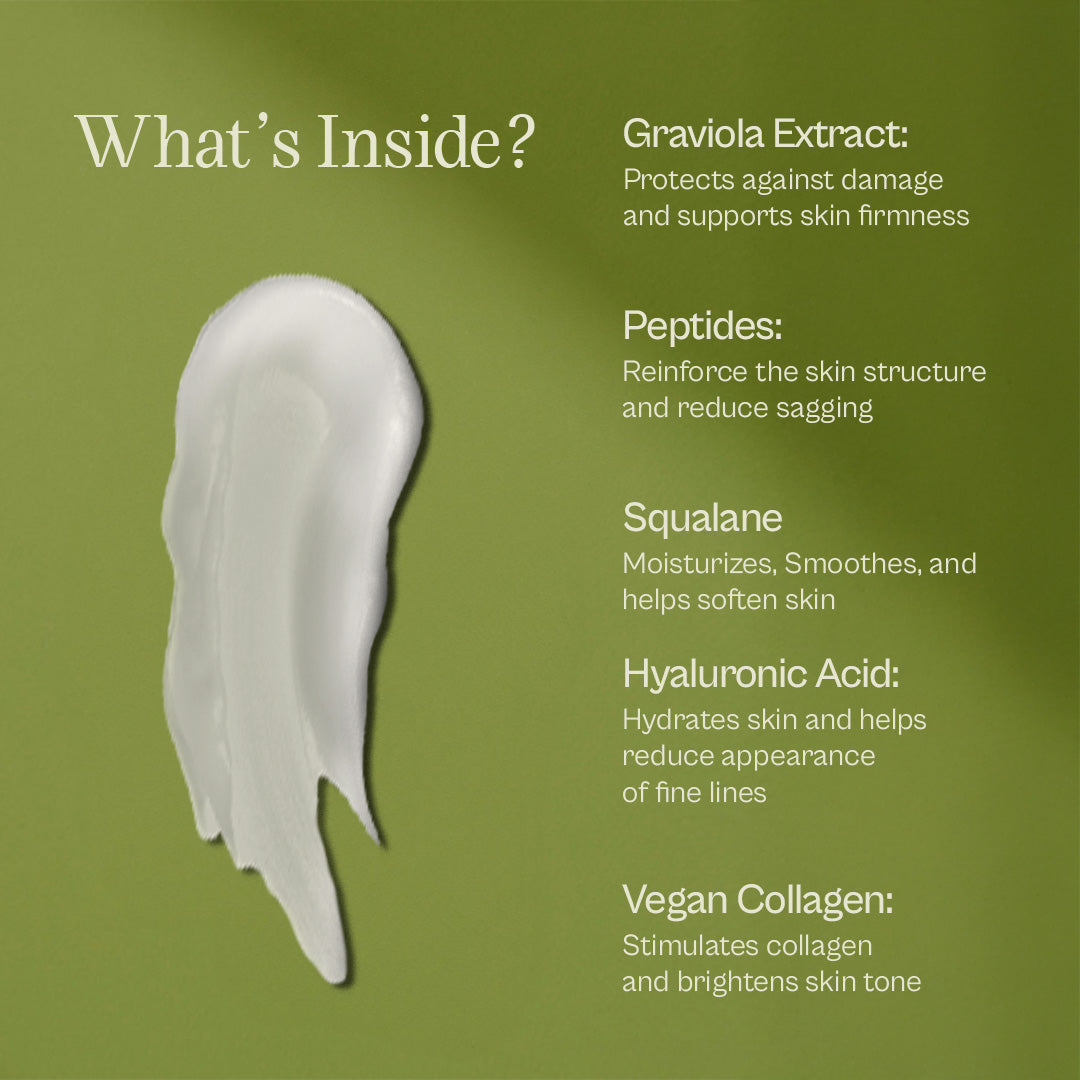 Water (Aqua), Dicaprylyl Carbonate, Cetearyl Alcohol, Glycerin, Cetearyl Olivate, Sorbitan Olivate, Carthamus Tinctorius (Safflower) Seed Oil, qualane, Annona Muricata (Graviola) Fruit Extract, Vegetable Collagen, Aloe Barbadensis Leaf Extract, Nicotiana Benthamiana