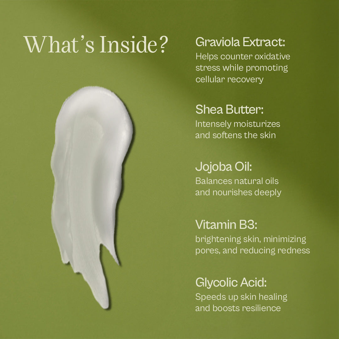 Water (Aqua), Cetearyl Ethylhexanoate, Pentylene Glycol, Squalane, Glycerin, Cetearyl Alcohol, Hydrogenated Ethylhexyl Olivate, Butyrospermum Parkii (Shea) Butter, Niacinamide, Cetearyl Olivate, Hydroxyethyl Acrylate/Sodium Acryloyldimethyl Taurate Copolymer, Sorbitan Olivate, Annona Muricata (Graviola) Fruit Extract, Hydrogenated Olive Oil Unsaponifiables, Limnanthes Alba (Meadowfoam) Seed Oil, Glycolic Acid, Tetrahexyldecyl Ascorbate, Dipotassium Glycyrrhizate (Licorice Root Extract), Sodium Stearoyl Glutamate, Tetrasodium Glutamate Diacetate, Sodium Hydroxide, Hexylene Glycol, Caprylyl Glycol, Ethylhexylglycerin, Phenoxyethanol